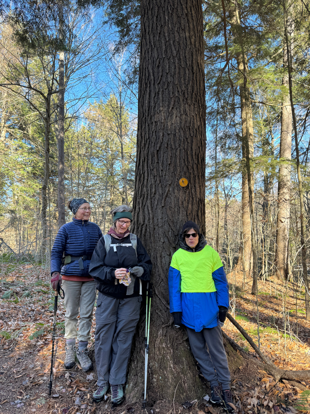 Glorious sunshine tamed the cool weather as temperatures climbed above 50F. We tromped through crunchy leaves around three loops admiring the bark and branches of the now