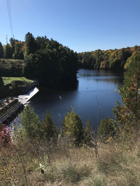 From there I shifted onto the Back Hannawa Road and followed it until I reached the gated (to cars) gravel road to the Sugar Island power station. Continuing alongside the penstock (large-diameter pipe) that brings water to the station’s turbines, I passed a parking area and started to climb on the gravel road to the dam.