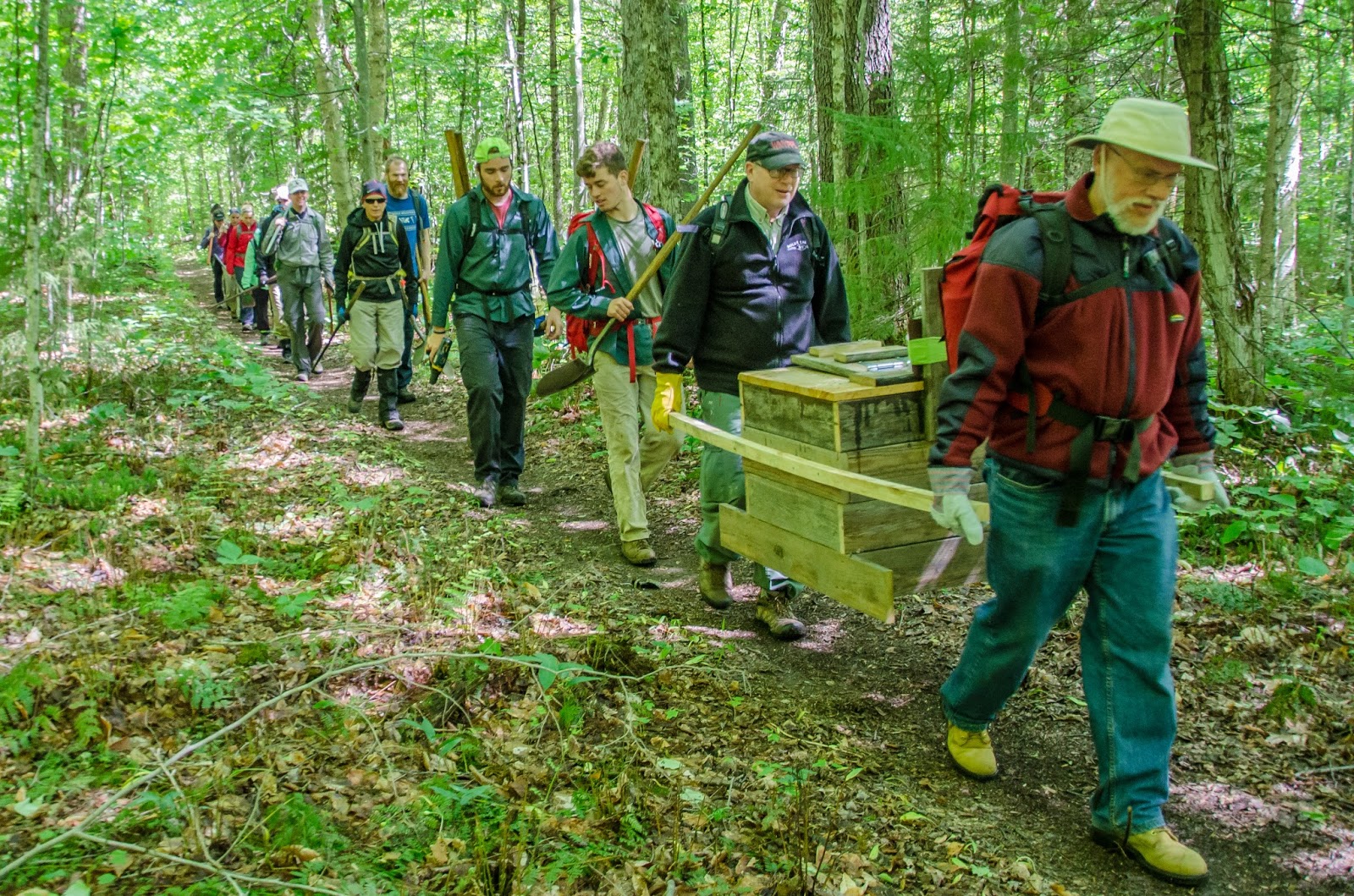 Left photo: Combined Glasby Pond and Cat Mountain Pond crews carrying in tools and one of the backcountry privies.